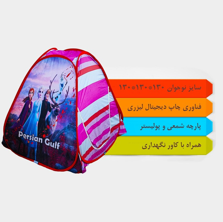چادر کودک یکی از بهترین وسیله های بازی برای کودکان می باشد و آن هارا ساعت ها به بازی و سرگرمی مشغول میکند . چادر های کودک در رنگ و طرح های متنوع و جذاب تولید شده تا دنیای کودکان را زیبا تر کند . برای کودکان از نظر ذهنی بسیار مشغول کننده و باعث افزایش خلاقیت ، شادابی و اعتماد به نفس می شود. از منظر تربیتی می توان کودکان را به حفظ نظم ، پاکیزگی و مسئولیت پذیری تشویق کرد. این محصول با بهره گیری از فناوری چاپ دیجیتال ، استفاده از پارچه مرغوب شمعی و پولیستر و فنر های مستحکم تهیه شده است . محیط داخل چادر محلی مناسب برای اسباب بازی های کودکان می باشد این محصول با ظاهری زیبا دارای یک درب و پنجره می باشد و همچنین به راحتی در تمامی فضاهای باز و بسته قابل استفاده است همراه این چادر کودک یک عدد کیف برای حمل و نگهداری تقدیم عزیزان می شود.