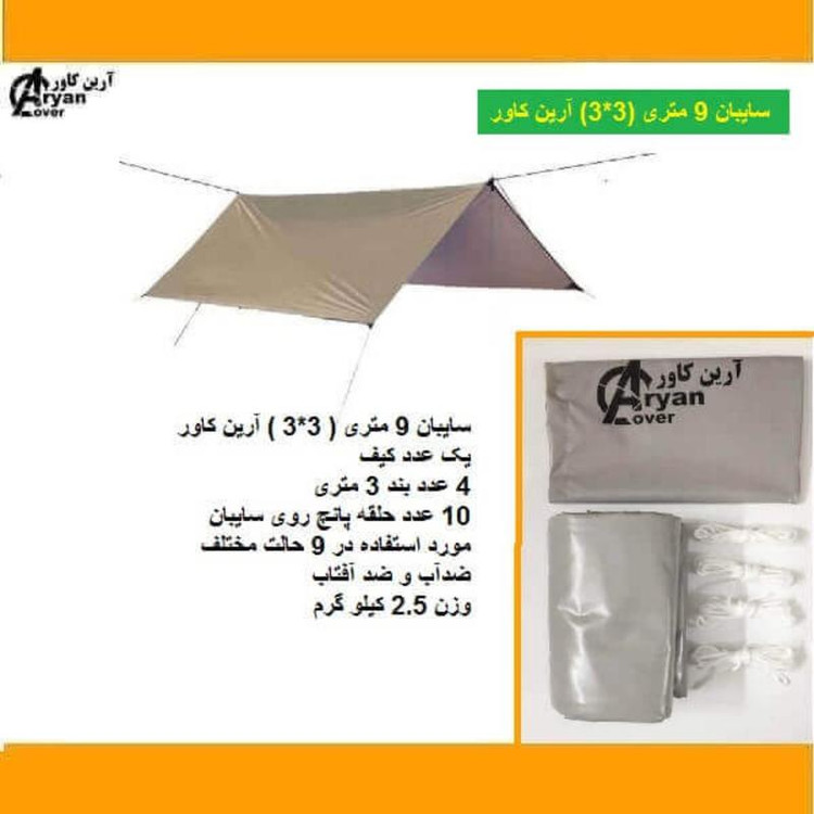 ابعاد این سایبان 3*3 متر می باشد به همراه 10 عدد سوراخ حلقه دار پانچ شده این سایبان برای استفاده در طبیعت و گردش کارایی بسیار خوبی می تواند داشته باشد جنس این سایبان ، برزنتی از نوع برزنت سبک بوده که ضدآب و آفتاب و دارای دوام بالا در مقابل کشش می باشد نسبت به ابعاد این سایبان ، تعداد مشخصی حلقه روی آن پانچ شده است و به همراه 4 عدد بند سمن 3 متری ، که بتوان سایبان را به محیط اطراف ( درخت، خودرو ، دیوار و… ) بست. در طبیعت و تفریح خانوادگی ، این نوع سایبان ها میتواند برای گردشگران بسیار کارآمد باشد تا از نور مستقیم خورشید و باران ها محفوظ بمانند