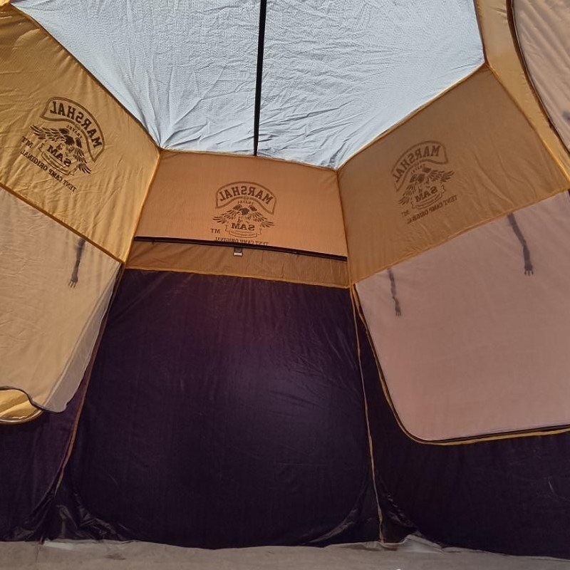 چادر مسافرتی کلبه ای لاکچری 18 نفره(بزرگترین چادر فنری) (18نفر نشسته - 6 الی 7 نفر خواب) بسیار خاص و متفاوت پنج دوخت تمامی دوخت گان دوزی شده مختص افراد خاص پسند دارای بست و حلقه فلزی جیب پهن زیپ خور داخل چادر مقاوم در برابر باد فنر 5.25 ضمانتی ضدآب و ضد آفتاب