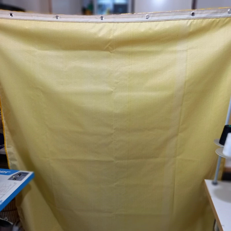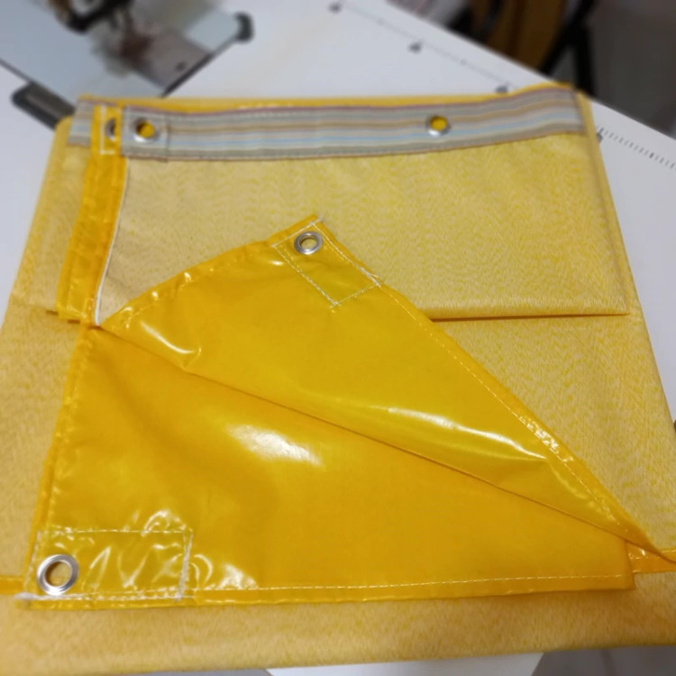 برزنت ضدآب شمعی دوخت پرده حیاط و بالکن و راه پله برای جلوگیری از ورود سرما و آب همراه با حلقه پرسی و نوار دوزی و دور دوخت رنگ زرد ابعاد ۲ در ۱.۷ متر طول