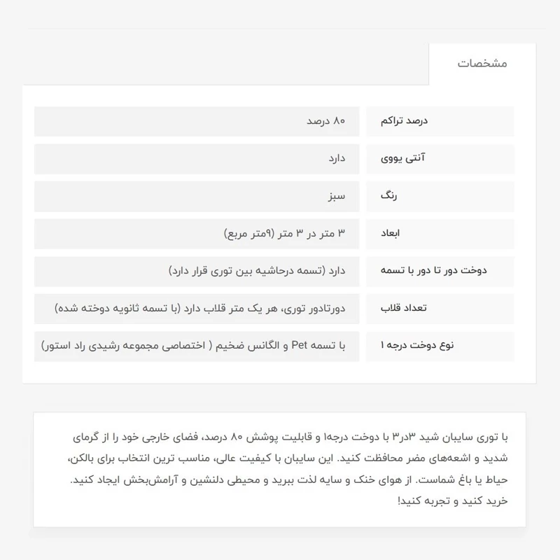 توری سایبان شید، 3در3، دوخت درجه 1، 80درصد