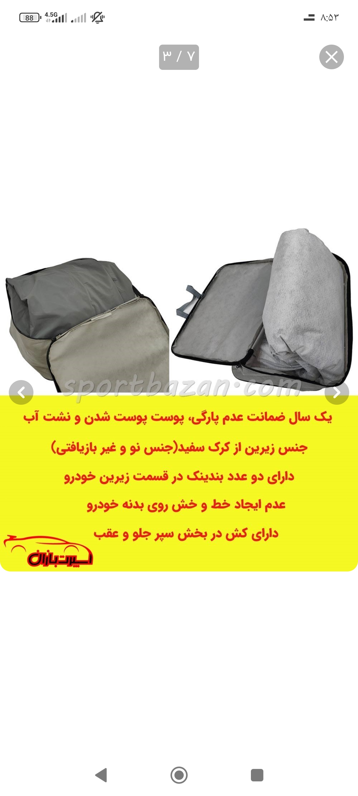 دارای دو عدد بندینک در قسمت زیرین خودرو, دارای کش در بخش سپر جلو و عقب, یک سال ضمانت عدم پارگی، پوست پ